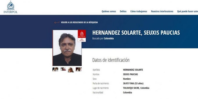 La Interpol publicó este jueves una circular roja contra el exlíder de las FARC y congresista colombiano Seuxis Paucias Hernández Solarte, alias “Jesús Santrich”, con lo cual puede ser capturado en cualquiera de los 194 países miembros de ese organismo internacional.