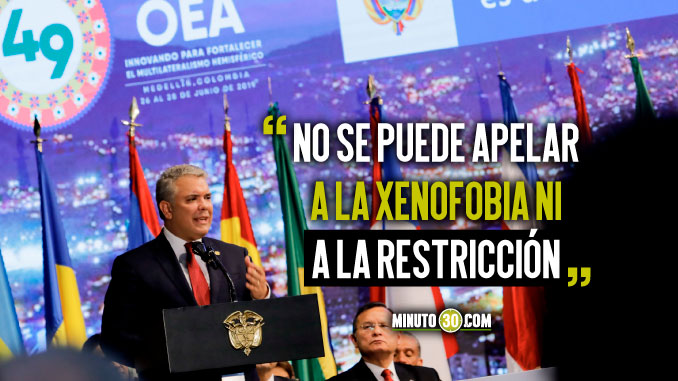 Durante el acto de instalación de la 49 Asamblea General de la OEA en Medellín, el mandatario destacó que Colombia ha recibido con ‘fraternidad’ a los hermanos venezolanos, porque considera que en los momentos de tragedia no se puede apelar ni a la xenofobia ni a la restricción, e hizo un llamado para que entre todos los países de la organización se comparta la atención a la crisis migratoria.
