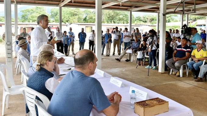 Duque visitó el ETCR ubicado en la vereda de Pondores, que forma parte del municipio de Fonseca, en el departamento caribeño de La Guajira, acompañado por el enviado especial de la Unión Europea al proceso de paz, Eamon Gilmore.