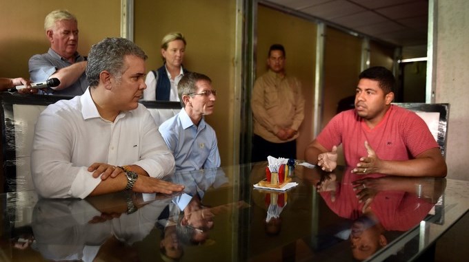 Duque visitó el ETCR ubicado en la vereda de Pondores, que forma parte del municipio de Fonseca, en el departamento caribeño de La Guajira, acompañado por el enviado especial de la Unión Europea al proceso de paz, Eamon Gilmore.