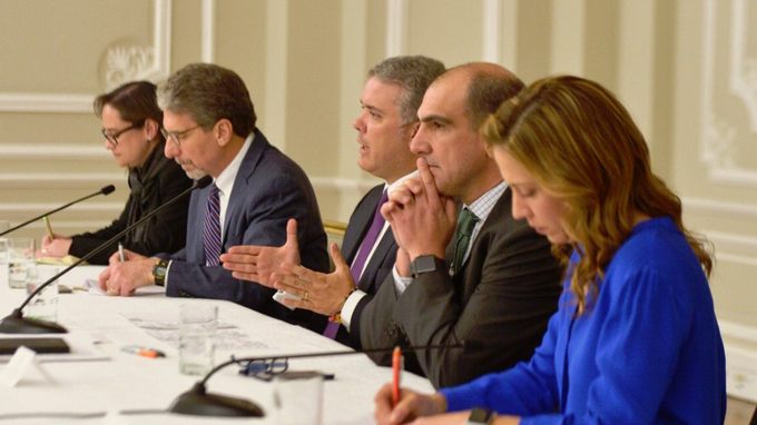 La reunión entre ambos fue a puerta cerrada y a ella acudieron el ministro de Relaciones Exteriores, Carlos Holmes Trujillo, y de Defensa, Guillermo Botero, según puede verse en las fotos de la reunión difundidas por la Presidencia.