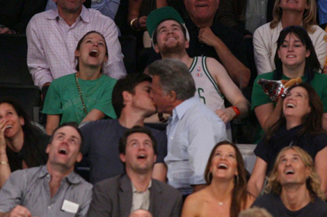 Los aficionados al baloncesto que ayer asistieron a la final del partido entre Los Angeles Lakers y los Boston Celtics se llevaron una gran sorpresa. La gran pantalla del estadio Staples Center mostró un beso entre el actor Dustin Hoffman y su amigo Jason Bateman.