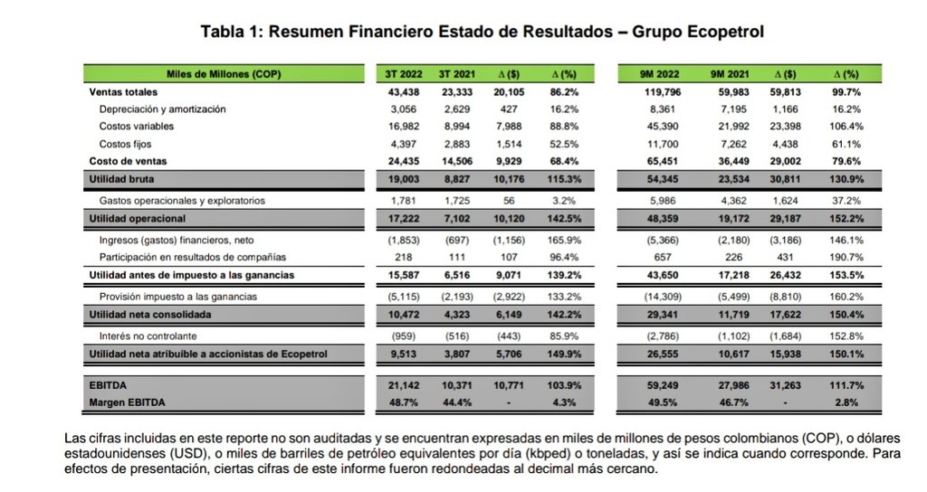 De acuerdo con el informe, Ecopetrol en el tercer trimestre registró ingresos por $43,4 billones, una utilidad neta de $9,5 billones, un Ebitda de $21,1 billones y un margen Ebitda de 48,7 %. En cuanto a los nueve meses corridos de este año, se registró una utilidad neta de 26.6 billones.