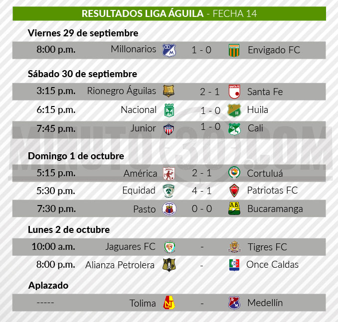 Vale la pena recordar que la decimocuarta jornada aún tiene partidos pendientes, entre ellos el de Deportes Tolima e Independiente Medellín, que probablemente se jugaría el próximo fin de semana.