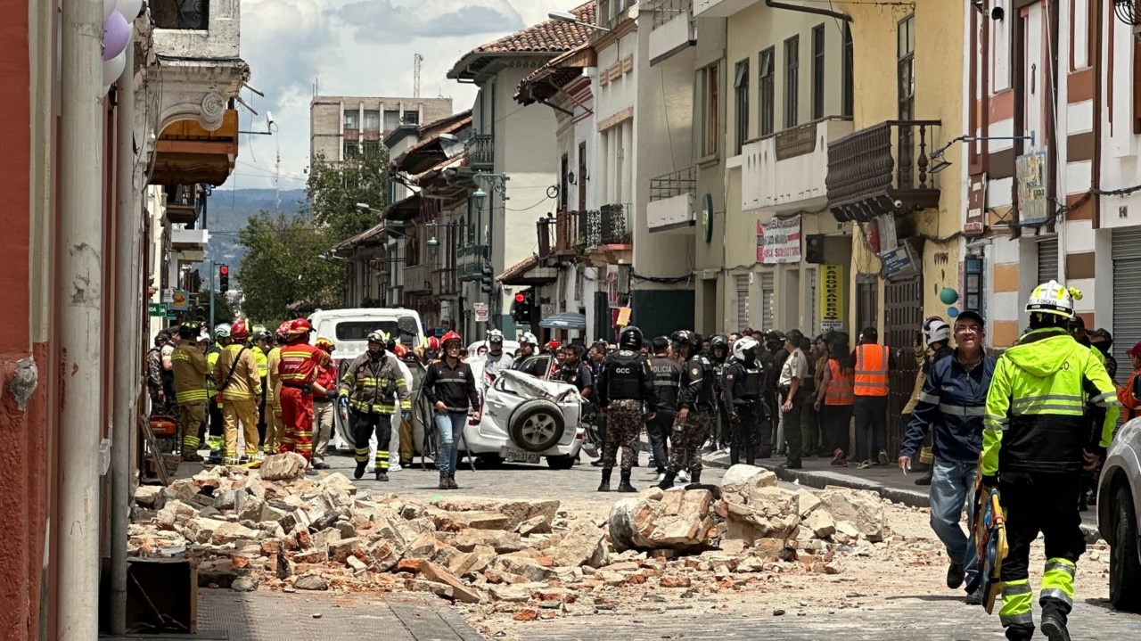 Personas observan los daños ocasionados por el sismo de magnitud 6,5 en la escala abierta de Richter, el 18 de marzo de 2023, en la ciudad de Cuenca (Ecuador). EFE/Robert Puglla