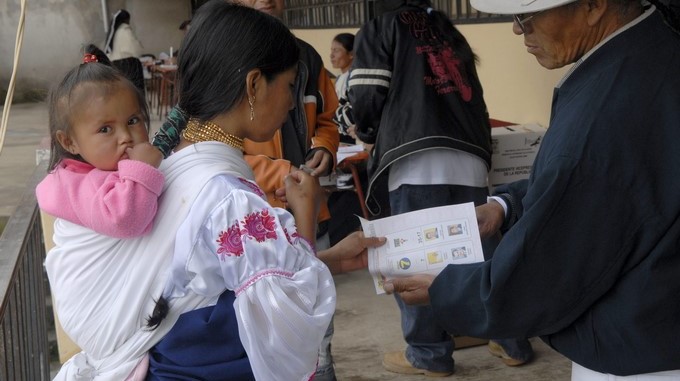 Una mujer indígena ecuatoriana recibe la pepeleta de votación