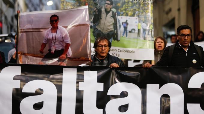 Periodistas y familiares de los tres trabajadores del diario El Comercio, secuestrados en la frontera colombo-ecuatoriana, participan en una marcha solidaria el 5 de abril de 2018, en Quito (Ecuador). EFE