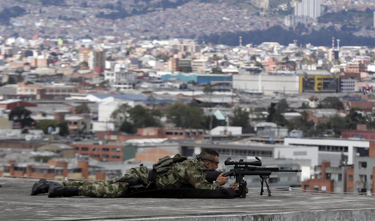 Un francotirador del Ejército de Colombia vigila este domingo en Bogotá (Colombia). Las autoridades colombianas implosionaron este domingo el edificio que era sede del Ministerio de Defensa en Bogotá por una falla estructural y con lo cual se inicia el “Proyecto Fortaleza”, con el que se prevé construir allí un nuevo complejo administrativo para las Fuerzas Militares. EFE/ Carlos Ortega