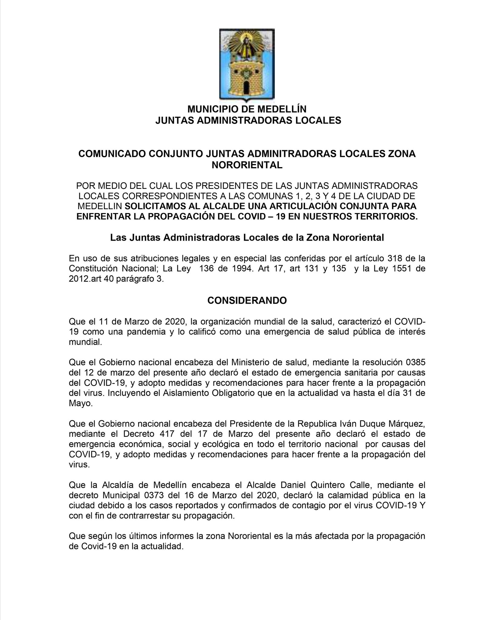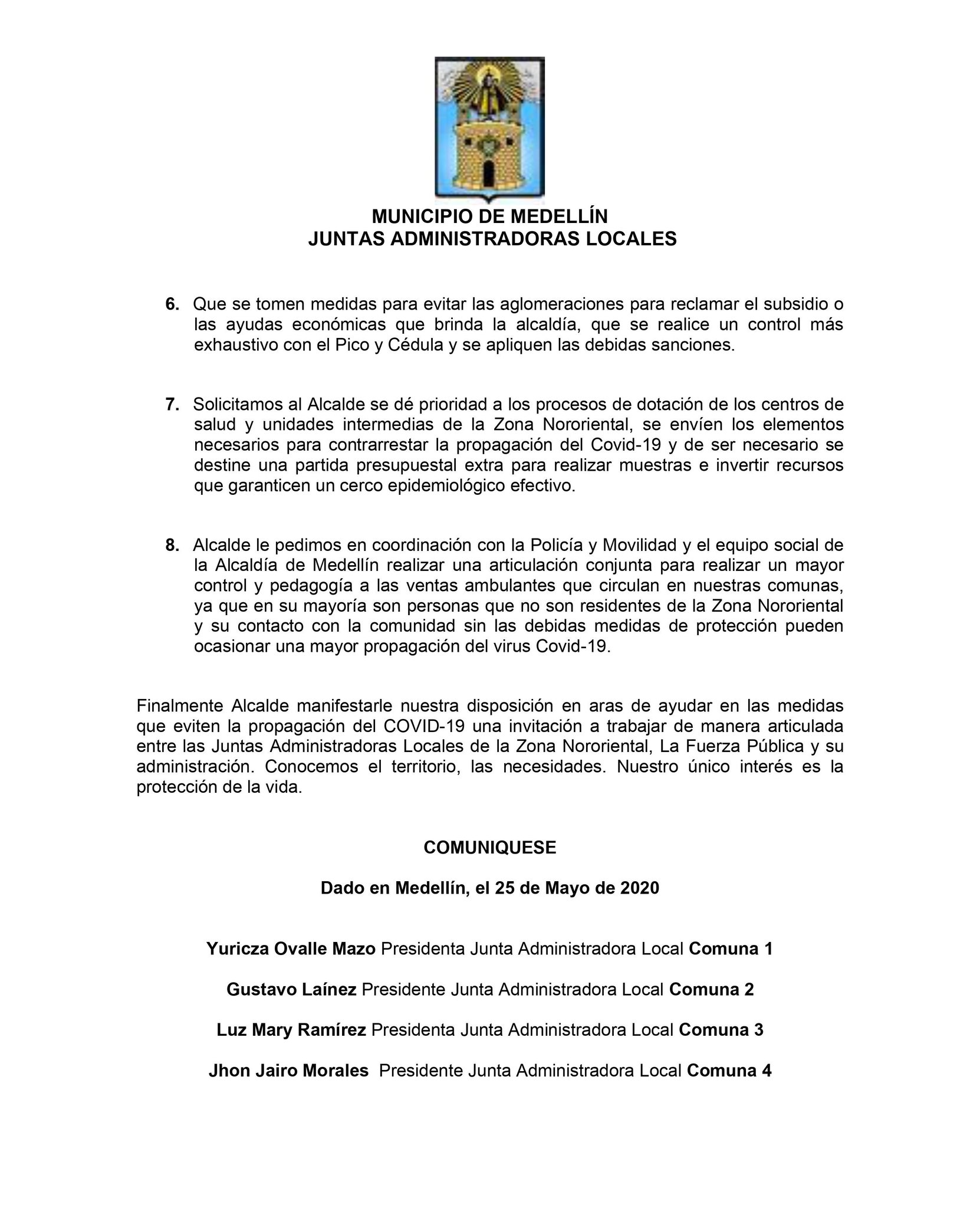 Los presidentes de las Juntas Administradoras Locales de las Comunas 1, 2, 3 y 4 pidieron a la Alcaldía de Medellín un puesto de mando unificado para enfrentar la Covid-19.