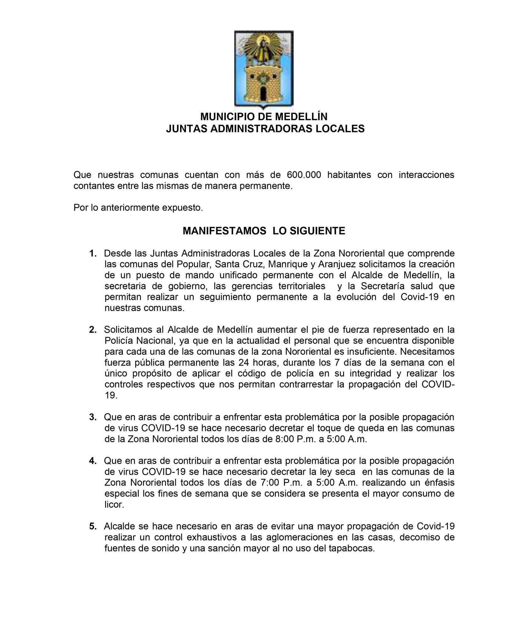 Así mismo, dentro de la misiva también pidieron que “en aras de contribuir a enfrentar esta problemática por la posible propagación del virus Covid-19 se hace necesario decretar el toque de queda en las comunas de la zona nororiental todos los días de 8:00 pm a 5:00 a.m.”