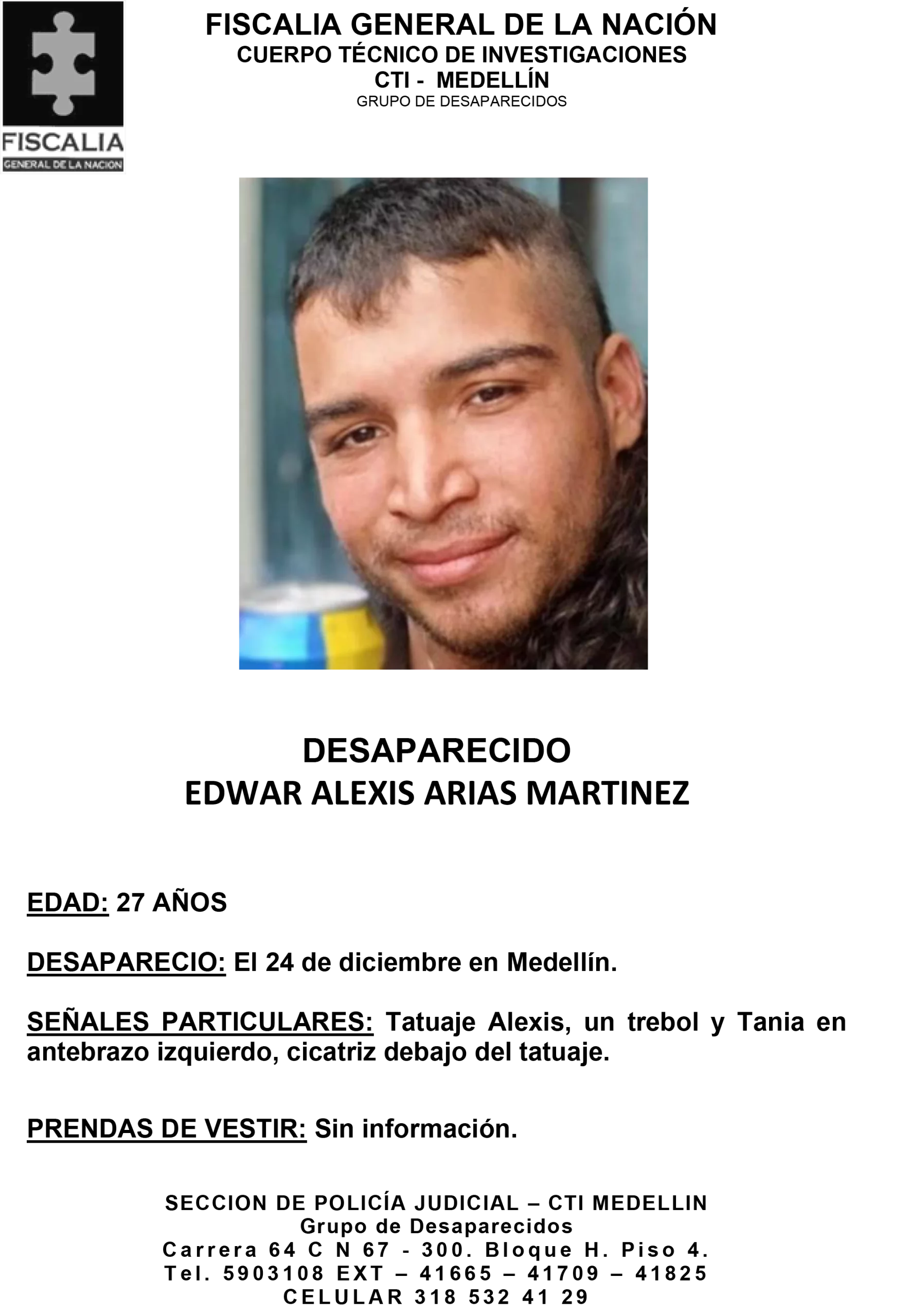 Edwar Alexis Arias Martínez, de 27 años, desapareció el 24 de diciembre en Medellín. La información disponible sobre su paradero es limitada, y hasta el momento no se han reportado novedades sobre su localización.