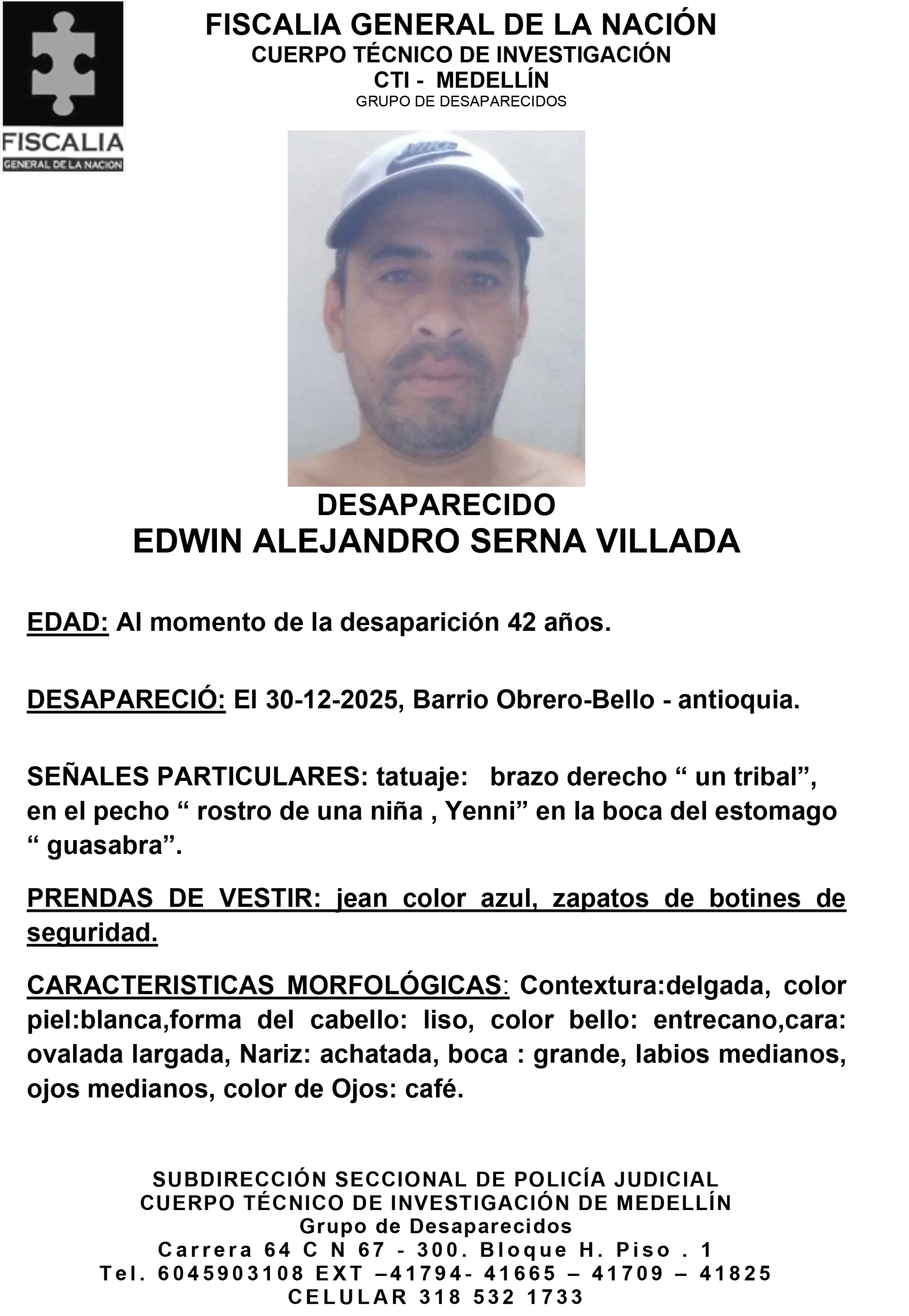 Edwin Alejandro Serna Villada tenía 42 años al momento de su desaparición, ocurrida el 30 de diciembre de 2025 en el Barrio Obrero del municipio de Bello, Antioquia.
