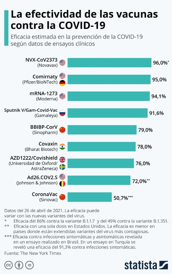 De acuerdo a las cifras publicadas en The New York Times basadas en ensayos clínicos en diferentes países y con datos del 26 de abril de 2021, así está el porcentaje estimado de efectividad de las vacunas contra el Covid-19: