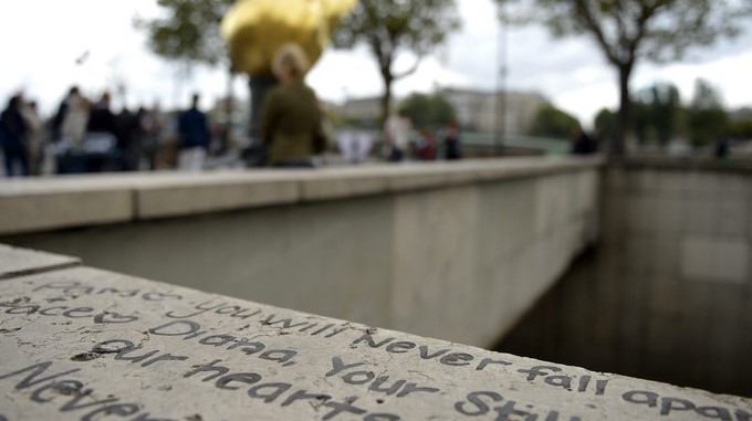 Notas de recuerdo sobre el túnel Alma, en París, para conmemorar la muerte de Diana Spencer, Princesa de Gales, quien murió en compañía de su compañero sentimental, Dody Al Fayed, el 31 de agosto de 1997 cuando el automóvil que les transportaba se estrelló a gran velocidad contra una de las columnas. EFE/Archivo