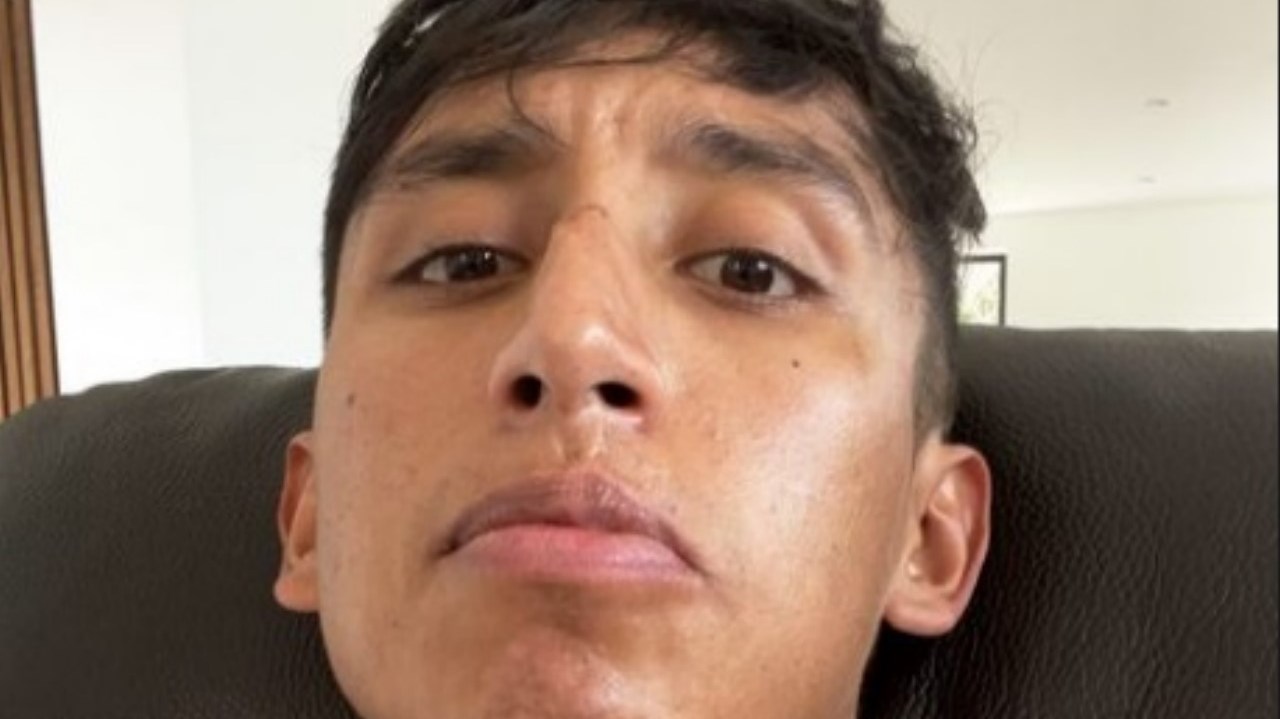En la foto aparece Egan Bernal mirando a la cámara mientras señala con sus dedos el ‘costurón’ que le quedó.