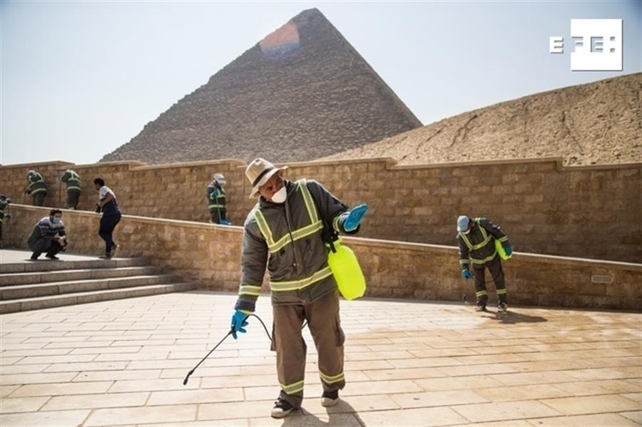 Un grupo de seis limpiadores con mascarillas y equipos de protección y fumigación se empeñaron hoy en la tarea de higienizar el entorno de las pirámides de Keops, Kefren y Micerinos, una imagen que formará parte del álbum de estampas que la pandemia está dejando en el mundo.