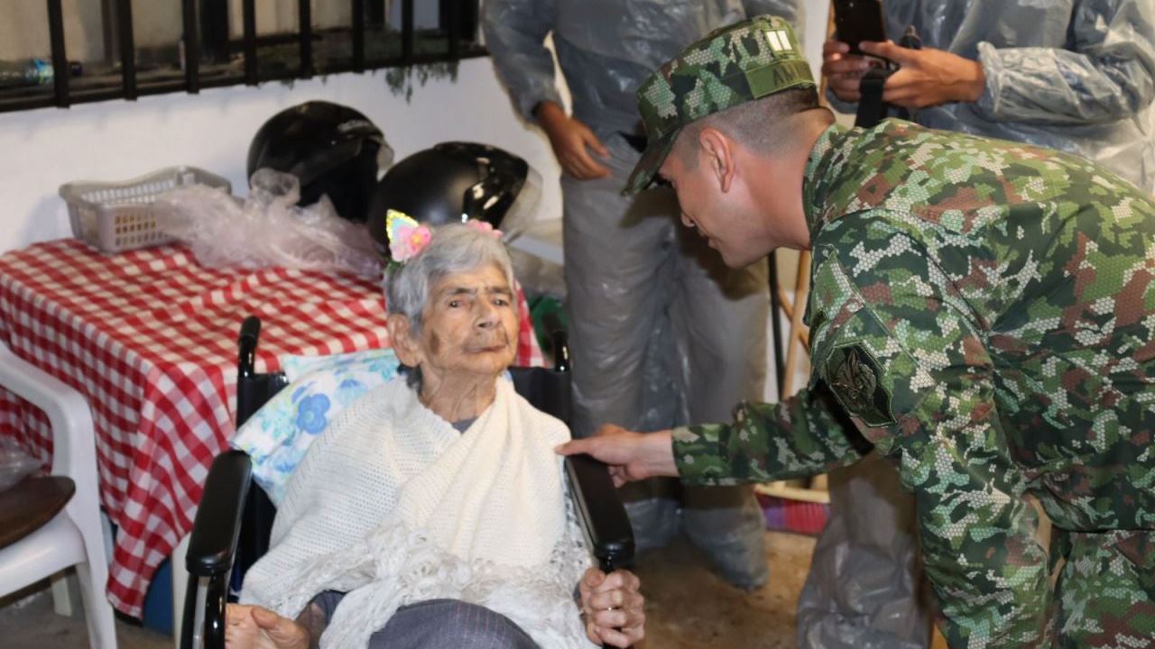 Resumen: La señora Berta Tulia Valencia de Gómez, quien padece de demencia senil, osteoporosis y hemiplejia, recibió una nueva silla de ruedas gracias al programa Fe en Colombia del Batallón de Apoyo de Acción Integral y Desarrollo N.º7 y la fundación Amigos Profesionales Voluntarios. La nueva silla de ruedas permitirá a la señora Berta una mayor comodidad y movilidad, mejorando su calidad de vida. Esta acción del Ejército Nacional demuestra su compromiso con el bienestar y la inclusión de las personas que más lo necesitan.
