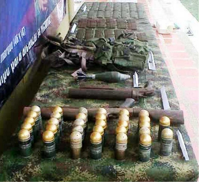 La caleta contenía dos lanzagranadas de calibre 40 mm, una granada de mortero calibre 60 mm, 1.033 cartuchos calibre 5.56 mm, 342 cartuchos calibre 7.62 mm para fusil AK-47 y dos chalecos multipropósito tipo americano originales.