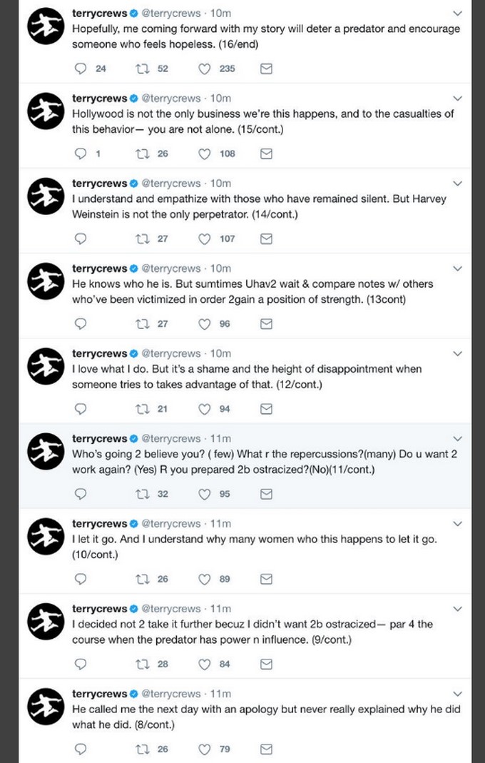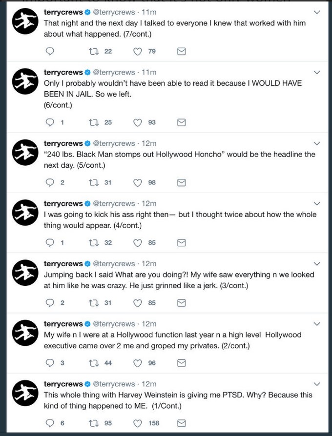 “Todo esto de Harvey Weinstein me está dando TEPT (Trastorno de Estrés Postraumático). ¿Por qué? Porque esta clase de cosa me pasó a MÍ. Mi esposa y yo estábamos en una función en Hollywood el año pasado y un alto ejecutivo se vino sobre mí y me manoseó mis partes privadas”, dijo Crews.
