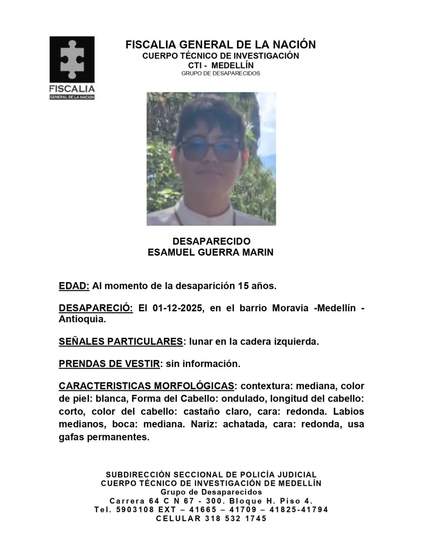 Minuto30.com .- Se solicita la colaboración ciudadana para localizar a Esamuel Guerra Marín, un adolescente de 15 años de edad, quien se encuentra desaparecido desde el pasado 1 de diciembre de 2025 en el barrio Moravia de Medellín, Antioquia.