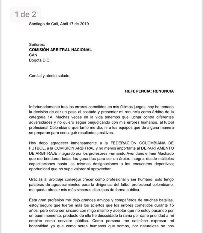 Finalmente por medio de la misiva agradeció a la Federación Colombiana de Fútbol, a la Comisión Arbitral y al Departamento de Arbitraje: “me brindaron todas las garantías para ser un árbitro integró, desde múltiples capacidades hasta las mismas designaciones a los encuentros; oportunidad que no supe valorar ni aprovechar”.