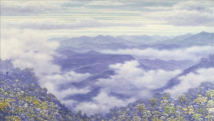 Una gigantesca pieza de lana de esa última artista, que con el nombre de “Riscos Calizos” simula las tonalidades de las capas de la tierra enrojecidas por los sedimentos, da la bienvenida al visitante a la entrada de la exposición, junto a un enorme paisaje sin título en el que Ariza refleja los microclimas de la selva colombiana.