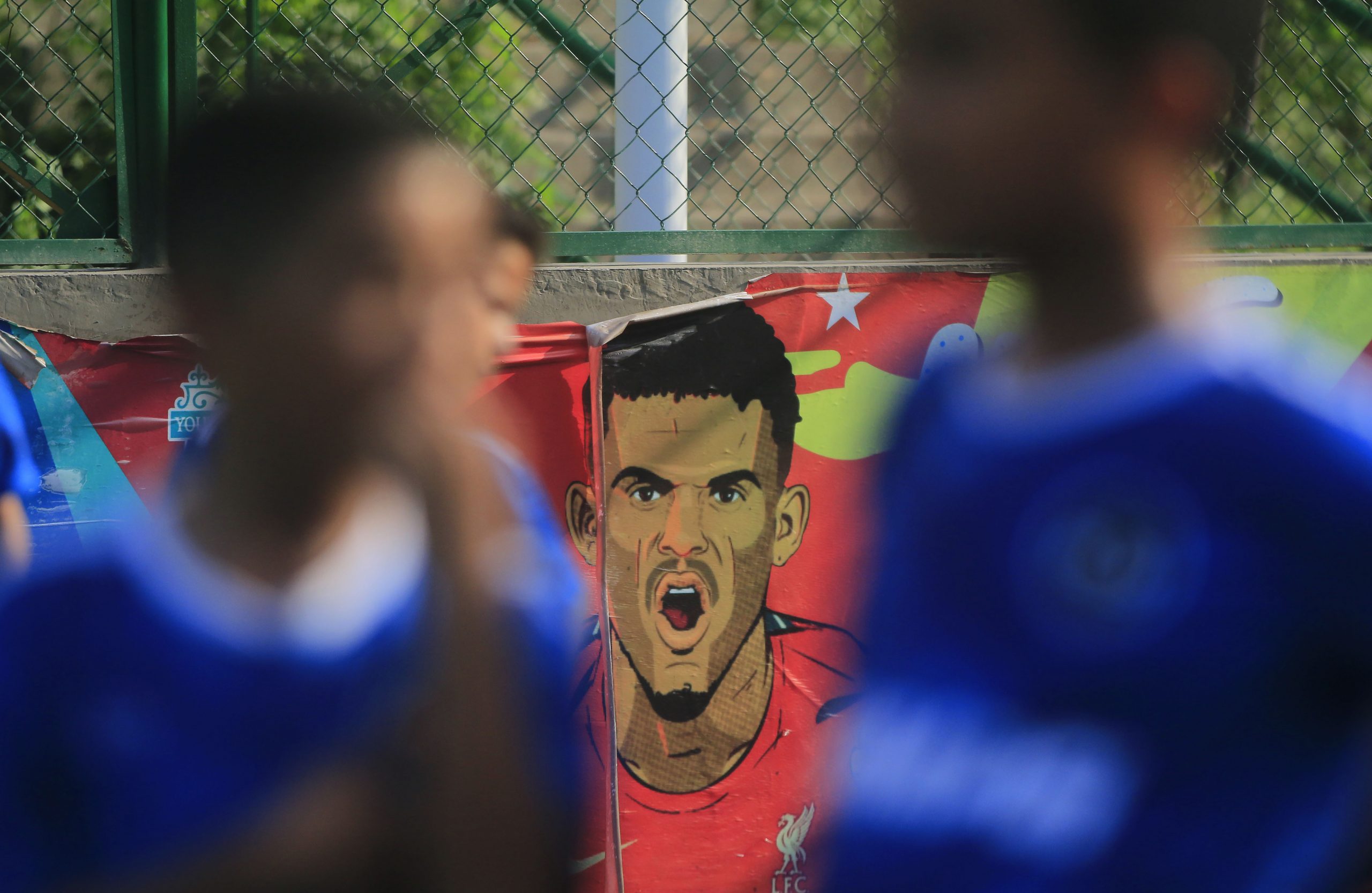 Frente a la casa de los abuelos del jugador de los Reds, en una cancha sintética que tiene la imagen del futbolista con las camisetas de los equipos en los que ha militado, pusieron a rodar el balón los niños de entre seis y diez años que hacen parte de las escuelas de fútbol de Barrancas, la población minera del norte de Colombia de es Díaz y su familia.