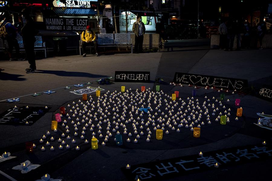 Un centenar de velas en el suelo dibujando un corazón, junto a los nombres de decenas de fallecidos escritos sobre alas de mariposas de papel y mascarillas. Así ha rendido tributo la noche de este jueves el barrio neoyorquino de Corona, en el distrito de Queens, a los miles de fallecidos por el COVID-19 en el epicentro de la pandemia.