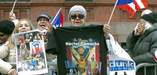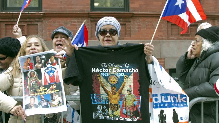 Unas mujeres sostienen fotos y camisetas con las imágenes del famoso púgil Héctor "Macho" Camacho y banderas de Puerto Rico. EFE/archivo