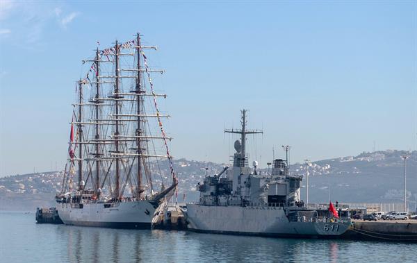 A su llegada al puerto de la ciudad norteña marroquí, el velero lanzó 21 salvas como muestra de respeto al país anfitrión, y sus 85 cadetes se situaron en los distintos mástiles del barco.