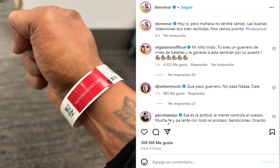 El artista publicó con el texto una imagen en la que porta en su mano una cintilla de la red hospitalaria Orlando Healt.