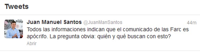 De inmediato el Presidente de la República, Juan Manuel Santos, desde su cuenta de twitter lanzó un tweet en el que deja en el aire la duda de quién y qué buscan con esto?: ¿Todos las informaciones indican que el comunicado de las Farc es apócrifo. La pregunta obvia: quién y qué buscan con esto?.