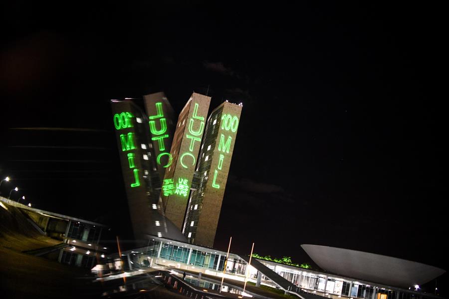 Organizada por entidades estudiantiles y con la autorización previa de la Cámara Alta, la proyección en las torres de la sede de la Cámara de Diputados y del Senado puso en evidencia el luto por la “triste marca” alcanzada de 100.000 muertos por COVID-19 en Brasil, según explicó a Efe el director institucional de la Unión Nacional de los Estudiantes (UNE), Felipe Eish.