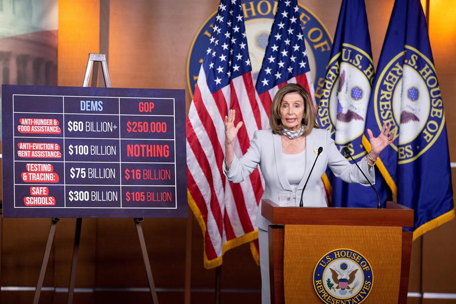 Los demócratas han presentado una propuesta de estímulo por cerca de 3,4 billones de dólares, mientras que los republicanos se han negado a ampliar su plan inicial de 1 billón de dólares, lo que refleja la gran distancia entre ambos.