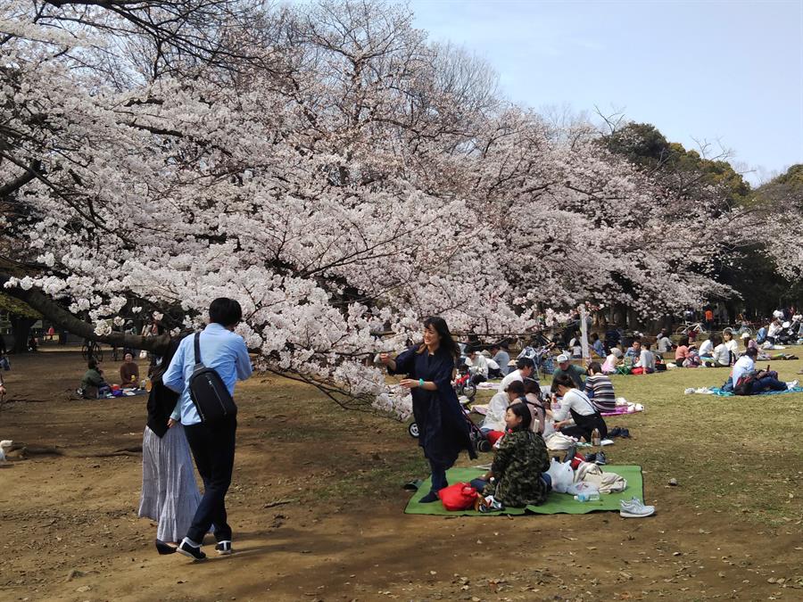 El buen tiempo está llevando a los japoneses masivamente a las calles y parques para participar en este ritual de observación de la belleza efímera de los brotes blancos y rosados llamado “hanami”, donde comen, beben y celebran en grupo.