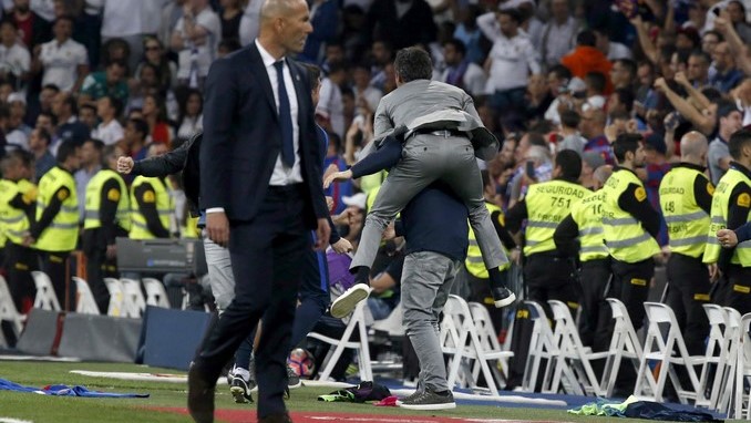 El entrenador del FC Barcelona, Luis Enrique Martínez (c), celebra el gol de la victoria de su equipo ante el Real Madrid, durante el partido correspondiente a la jornada 33 de primera división, que han disputado anoche en el estadio Santiago Bernabéu, en Madrid. EFE