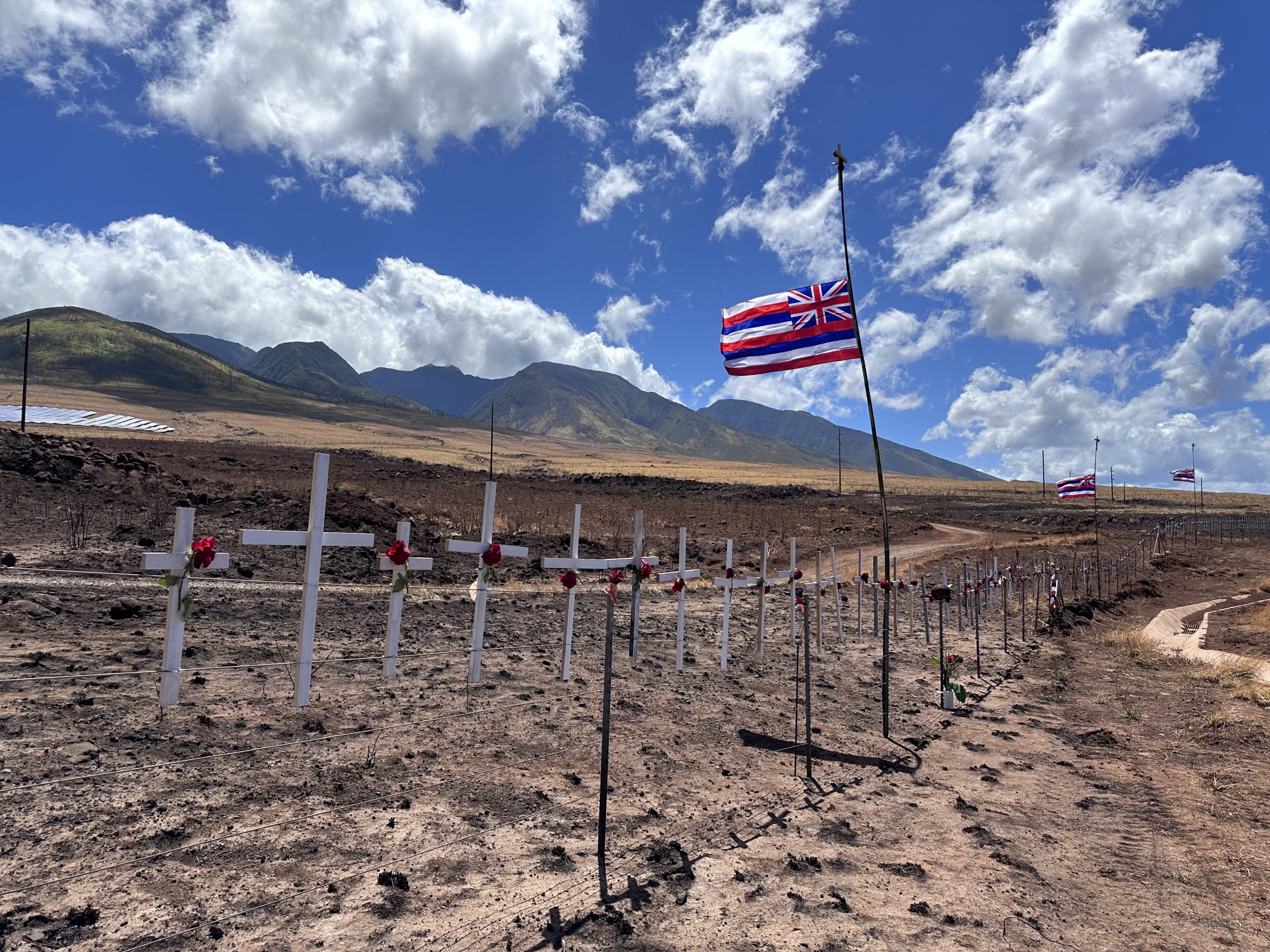 Sobre una de las cruces resalta la cubierta quemada de lo que un día fue una pelota de fútbol. Según explicó a EFE un vecino, esa pelota pertenecía a un niño de Maui que amaba ese deporte.