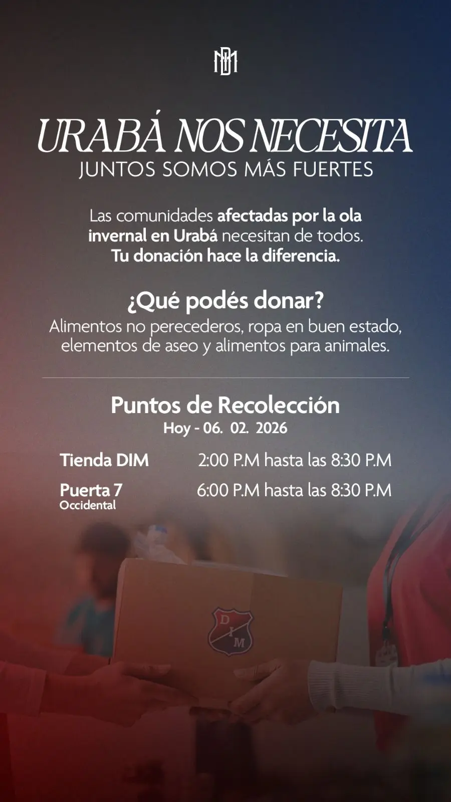 Resumen: El Deportivo Independiente Medellín se ha unido a la causa humanitaria por los damnificados de la ola invernal en Urabá bajo el lema "Juntos somos más fuertes", convocando a la ciudadanía a una jornada de recolección de ayudas este 6 de febrero de 2026. Los interesados en apoyar pueden donar alimentos no perecederos, ropa en buen estado, artículos de aseo y alimento para mascotas en la Tienda DIM, disponible hasta las 8:30 P.M., o en la Puerta 7 de Occidental a partir de las 6:00 P.M. Esta iniciativa busca brindar un alivio directo a las familias afectadas por las inundaciones, demostrando que la solidaridad del fútbol trasciende las canchas.