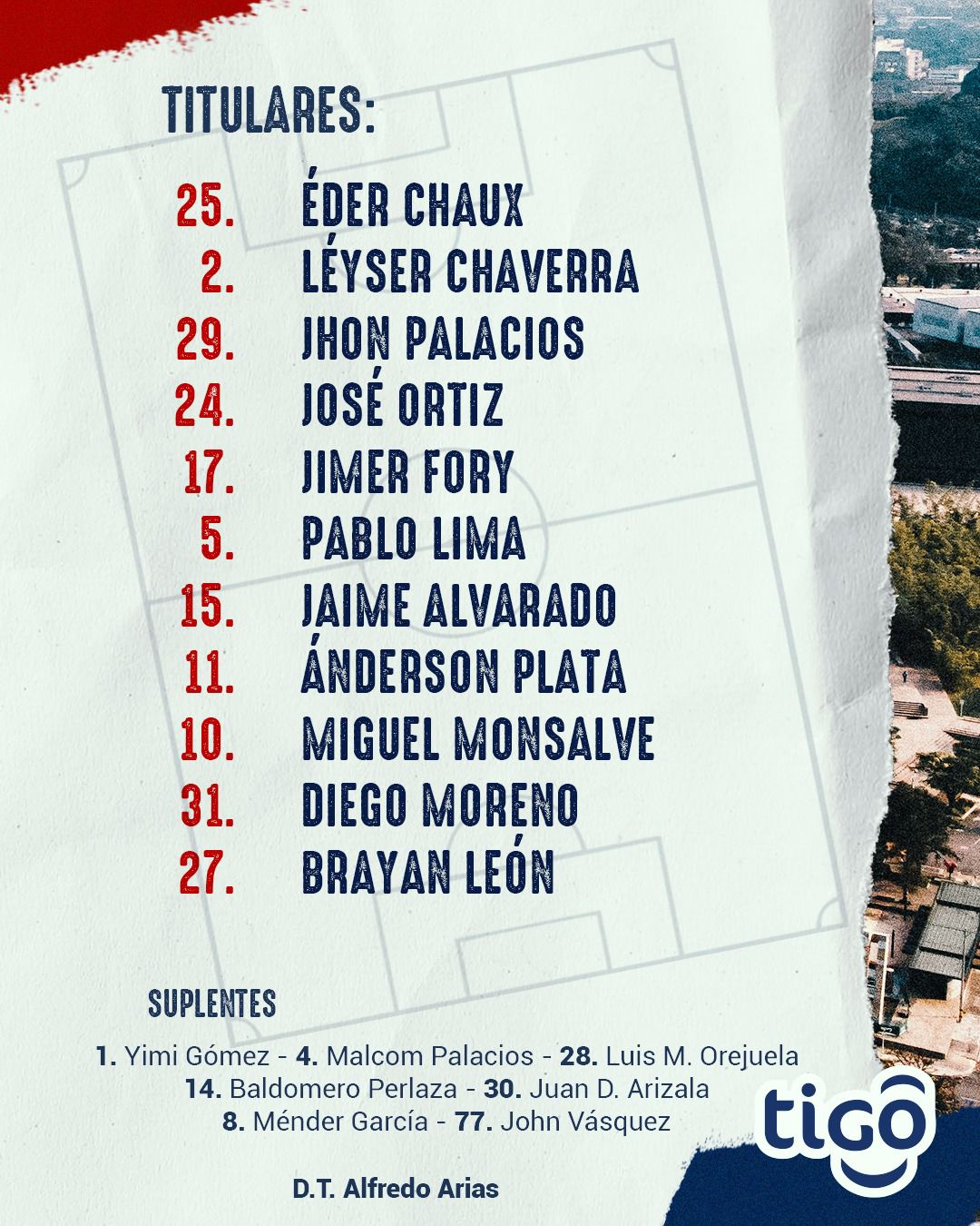 Así mismo serán titulares Pablo Lima, Jaime Alvarado, Ánderson Plata, Miguel Monsalve, Diego Moreno y Brayan León.