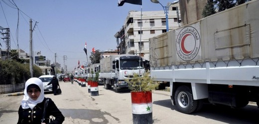 DAM02 DAMASCO (SIRIA), 28/04/2015.- Fotografía facilitada por la agencia de noticias oficial siria (SANA) que muestra a un grupo de sirios esperando para recibir ayuda humanitaria de parte de Cruz Roja y Media Luna Roja Siria, en Damasco, Siria, hoy, martes 28 de abril de 2015. Siria ha entrado en el cuarto año de una guerra civil que ha causado el desplazamiento de millones de personas y la muerte de al menos 220.000. EFE/-/SÓLO USO EDITORIAL/PROHIBIDA SU VENTA