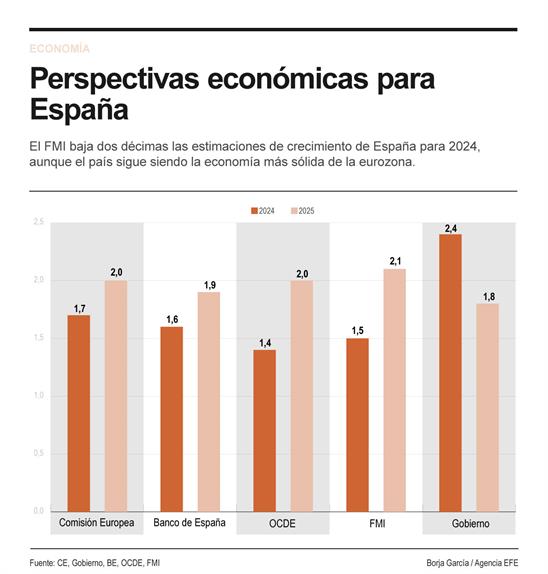 Washington, 30 ene (EFE).- El Fondo Monetario Internacional (FMI) bajó este martes dos décimas las estimaciones de crecimiento de España para este 2024 y las situó en el 1,5 %, aunque el país sigue siendo la economía más sólida de la eurozona, que crecerá sólo el 0,9 %.