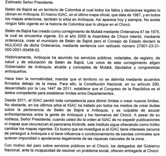 El mandatario departamental afirmó en la carta que la administración municipal “tiene pruebas de que los delegados del Gobierno Nacional ofrecieron publicar en el viniente mes de junio, mapas fraudulentos del IGAC que hagan creer que Belén de Bajirá es del Chocó”.