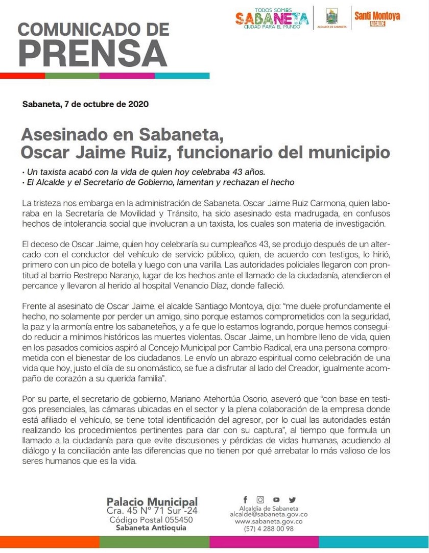 La alcaldía del municipio se pronunció frente a este hecho, lamentando la muerte de este hombre que era un reconocido líder social de ese municipio del sur del Valle de Aburrá. Además, trabajaba en la Secretaría de Movilidad y fue candidato al Concejo local.
