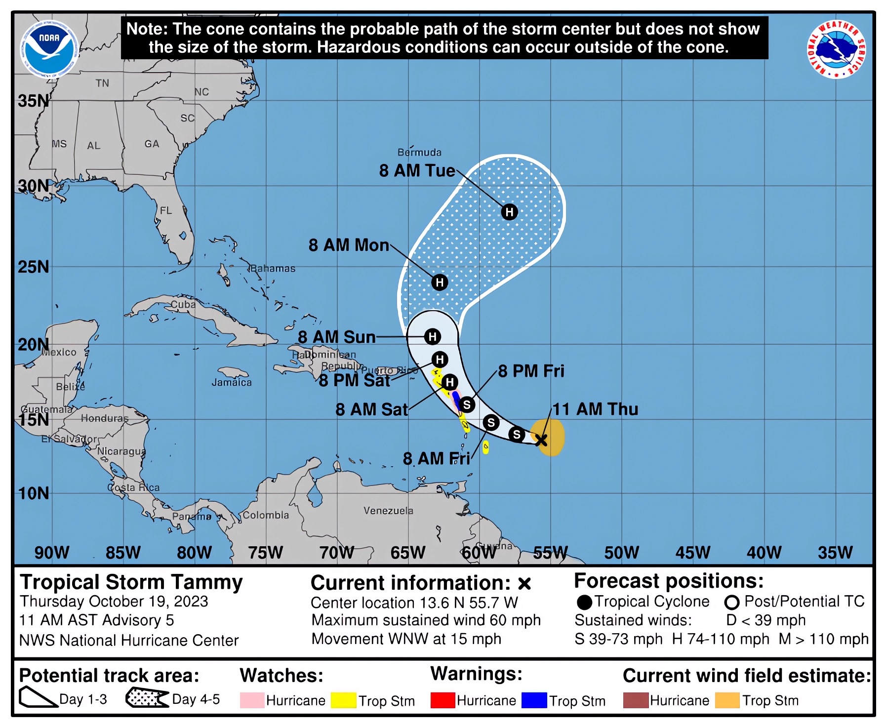 Tammy presentaba vientos máximos sostenidos de 85 millas por hora (140 km) con ráfagas más fuertes y tendrá cierto fortalecimiento seguido de fluctuaciones, según el último boletín del NHC.