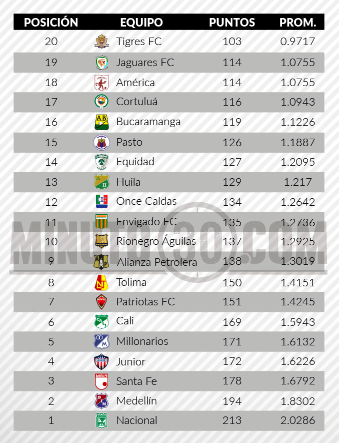 Pese a la inesperada victoria de Tigres ante el Medellín, los capitalinos no dejan la última posición de la fatídica tabla, siendo los principales candidatos para volver a la segunda división.