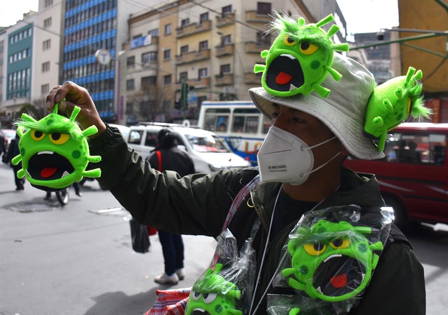 El boliviano Miguel Huallpara tuvo que cerrar su tienda de cotillones en La Paz al quedarse sin clientela por la cuarentena, pero no se ha rendido ante el temido virus que, por el contrario, le dio una nueva idea para mantener a su familia mediante la venta de unos simpáticos títeres del coronavirus.