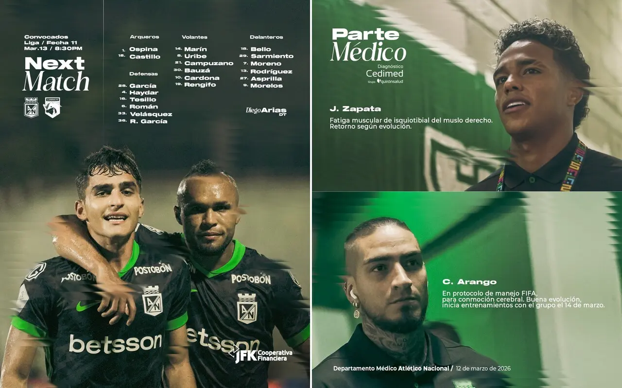 Juan Manuel Zapata: Presenta una fatiga muscular en el isquiotibial derecho. El defensor aún no se reintegra a trabajos de campo y su evolución es monitoreada día a día.