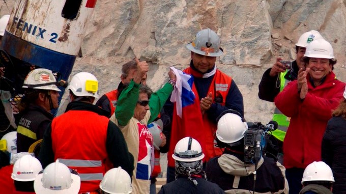 El minero Mario Gómez, (iz), de 63 años, saluda a su llegada a la superficie dentro de la cápsula Fénix
