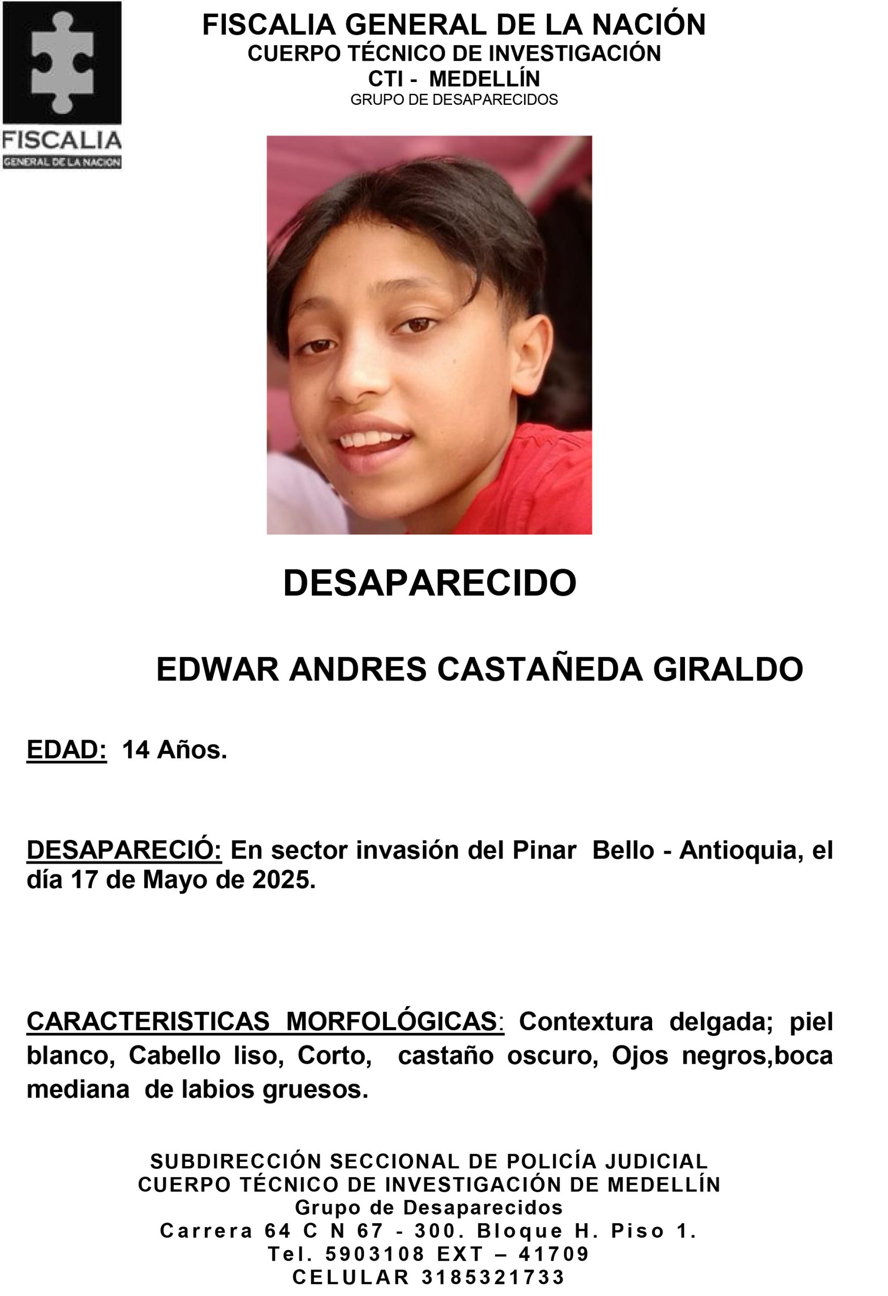 Edwar Andrés Castañeda Giraldo es un menor de 14 años que desapareció el 17 de mayo de 2025 en el sector de invasión El Pinar, ubicado en Bello, Antioquia.