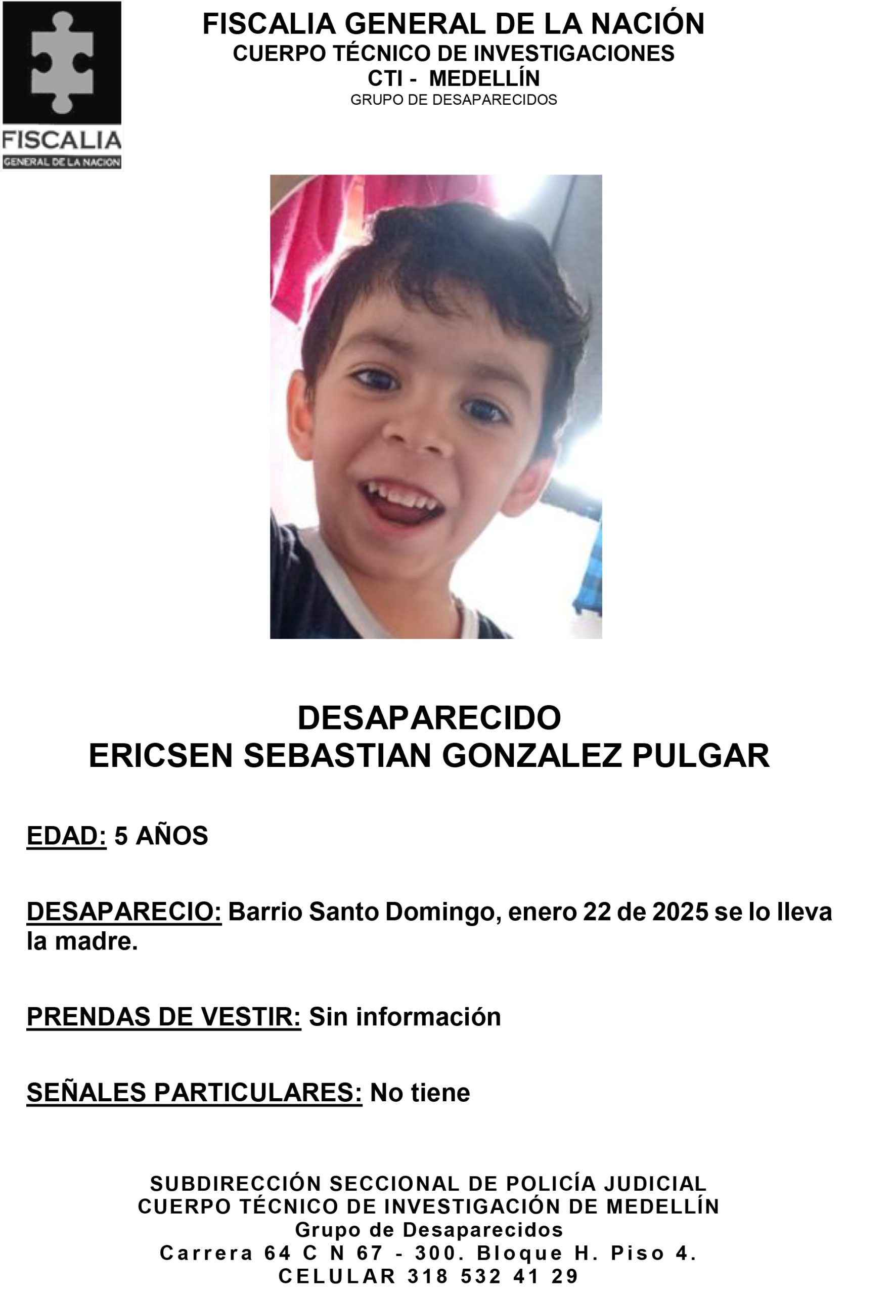 Resumen: Ericsen Sebastián González Pulgar es un niño de 5 años que desapareció el 22 de enero de 2025 en el barrio Santo Domingo.